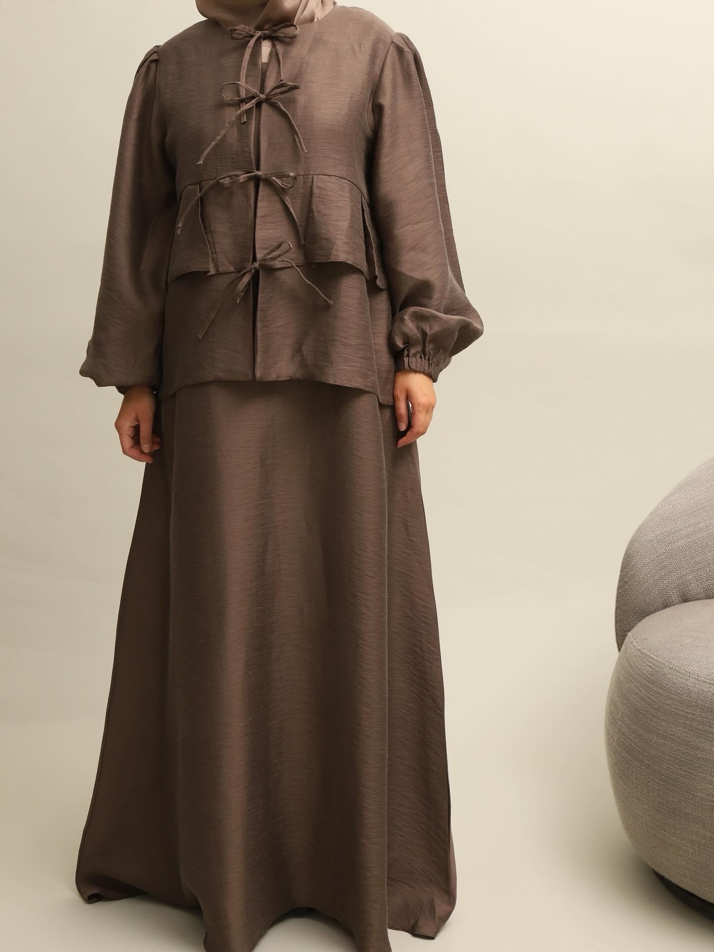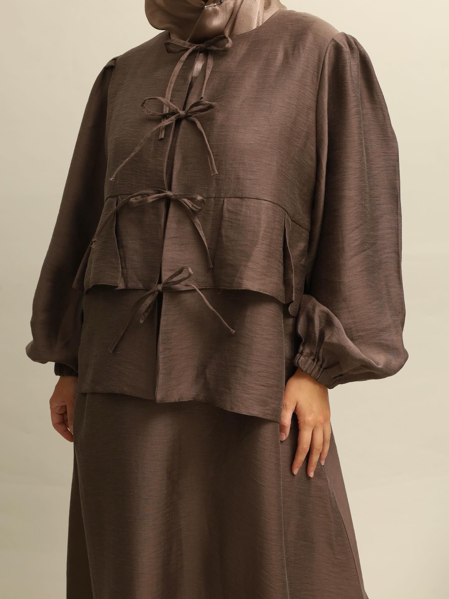 Komplet u čokoladnoj nijansi, od lagane mešavine svile i lana.Podhaljina i gornji deo na vezivanje.Za svaki dan koji traži lakoću i stil.