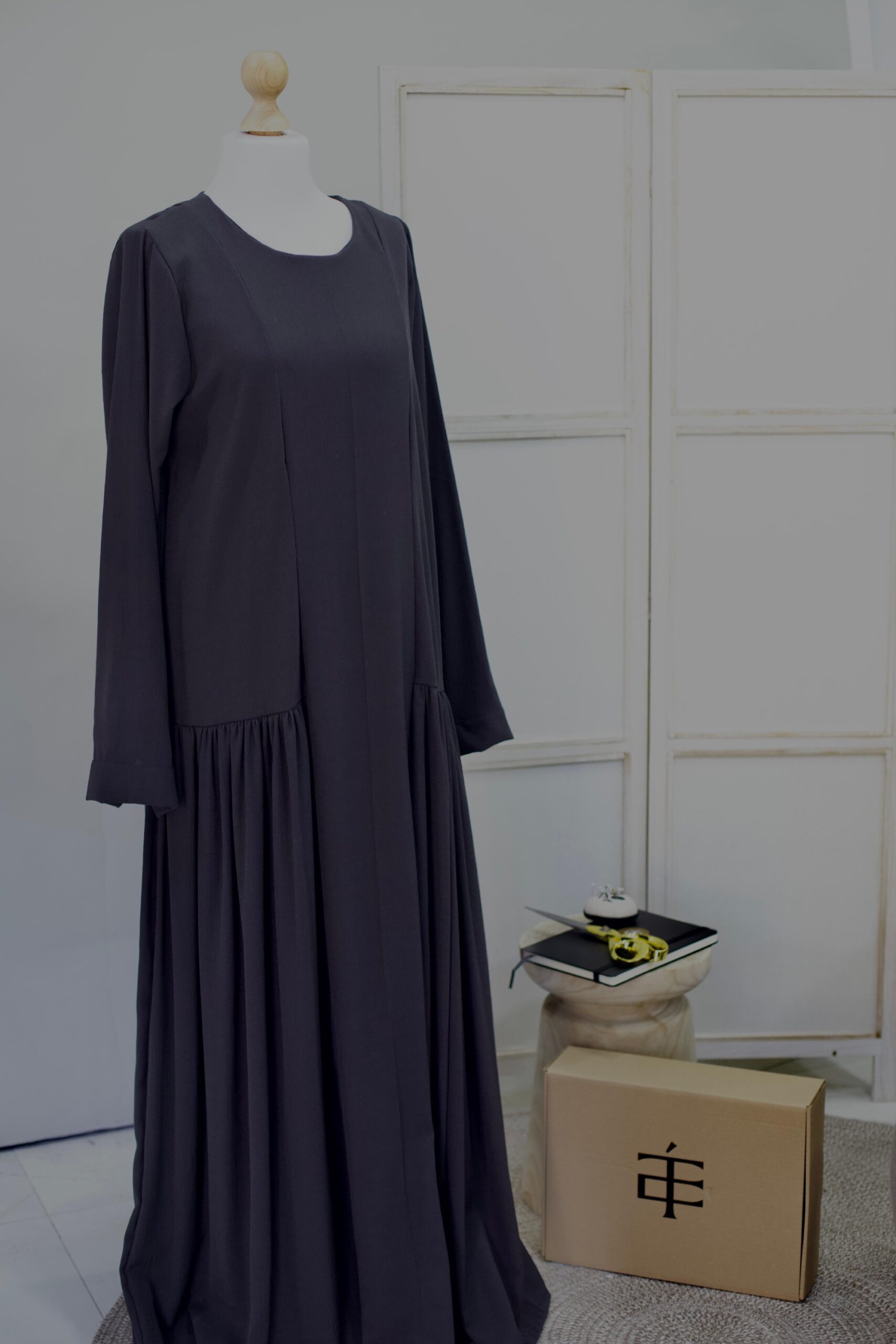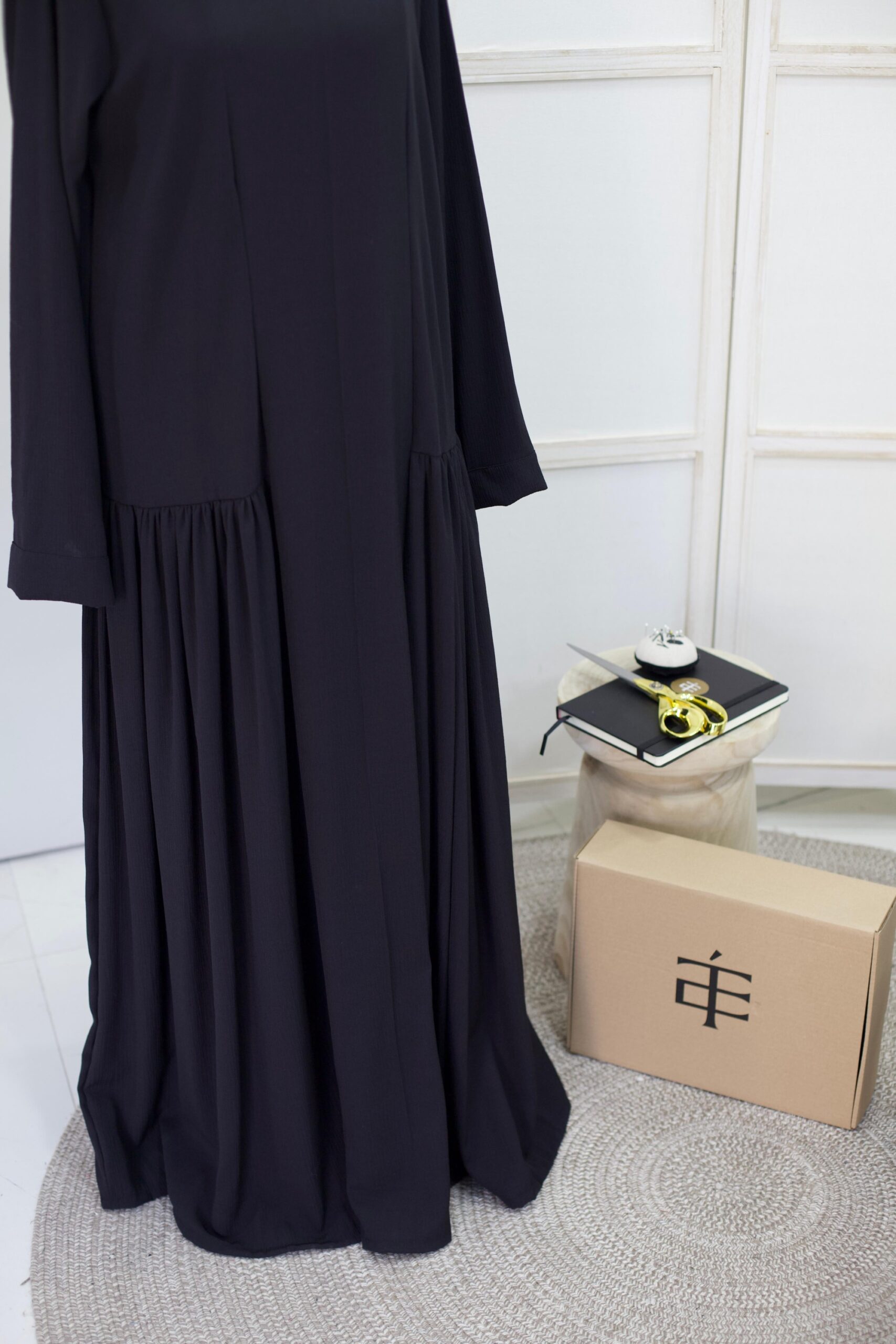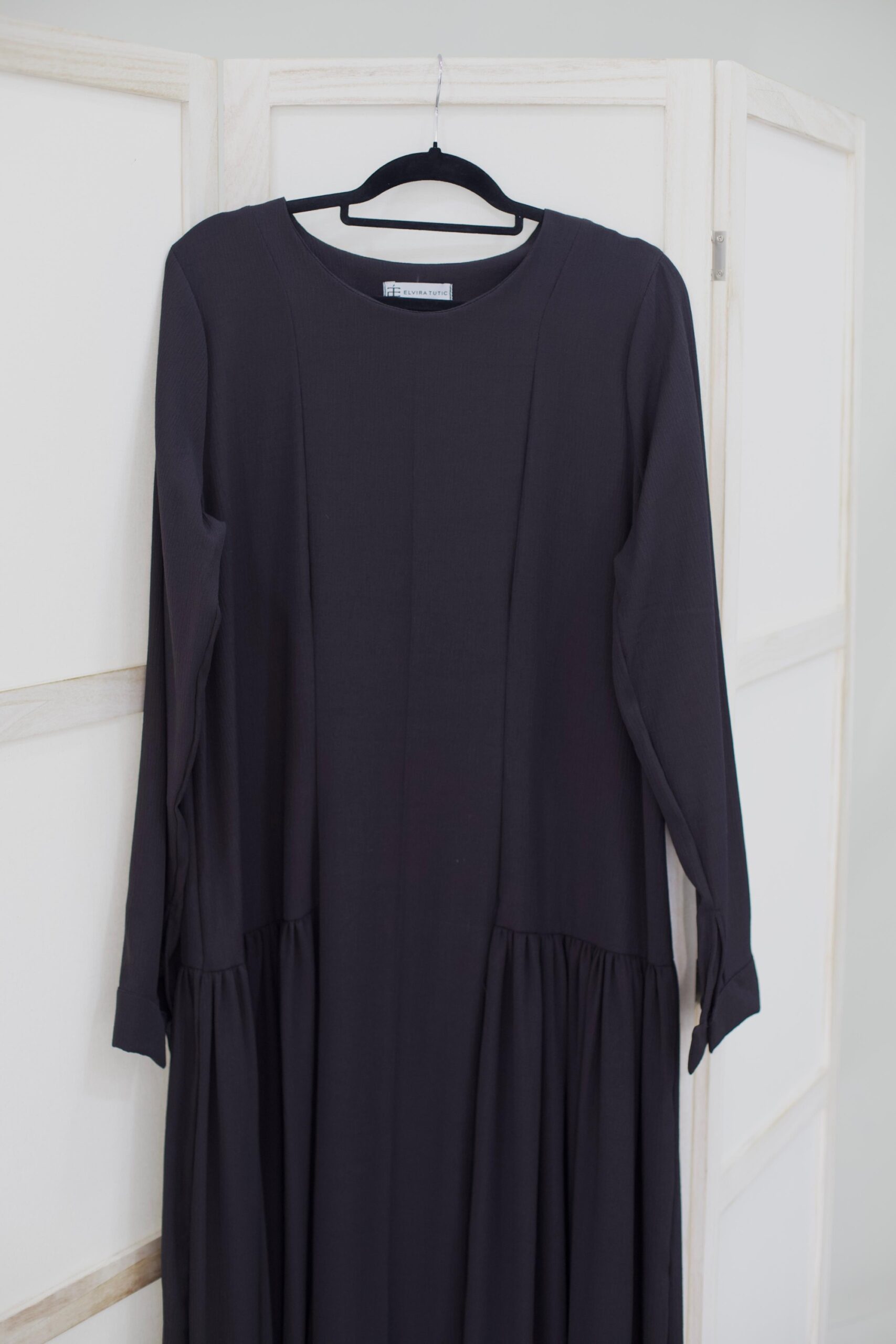 Modest crna haljina dugog kroja, sa diskretnim naborima malo ispod struka, koji nežno prate liniju tela i daju sofisticiranu siluetu. Savršena za sve prilike kada želite jednostavnu, a efektnu eleganciju.