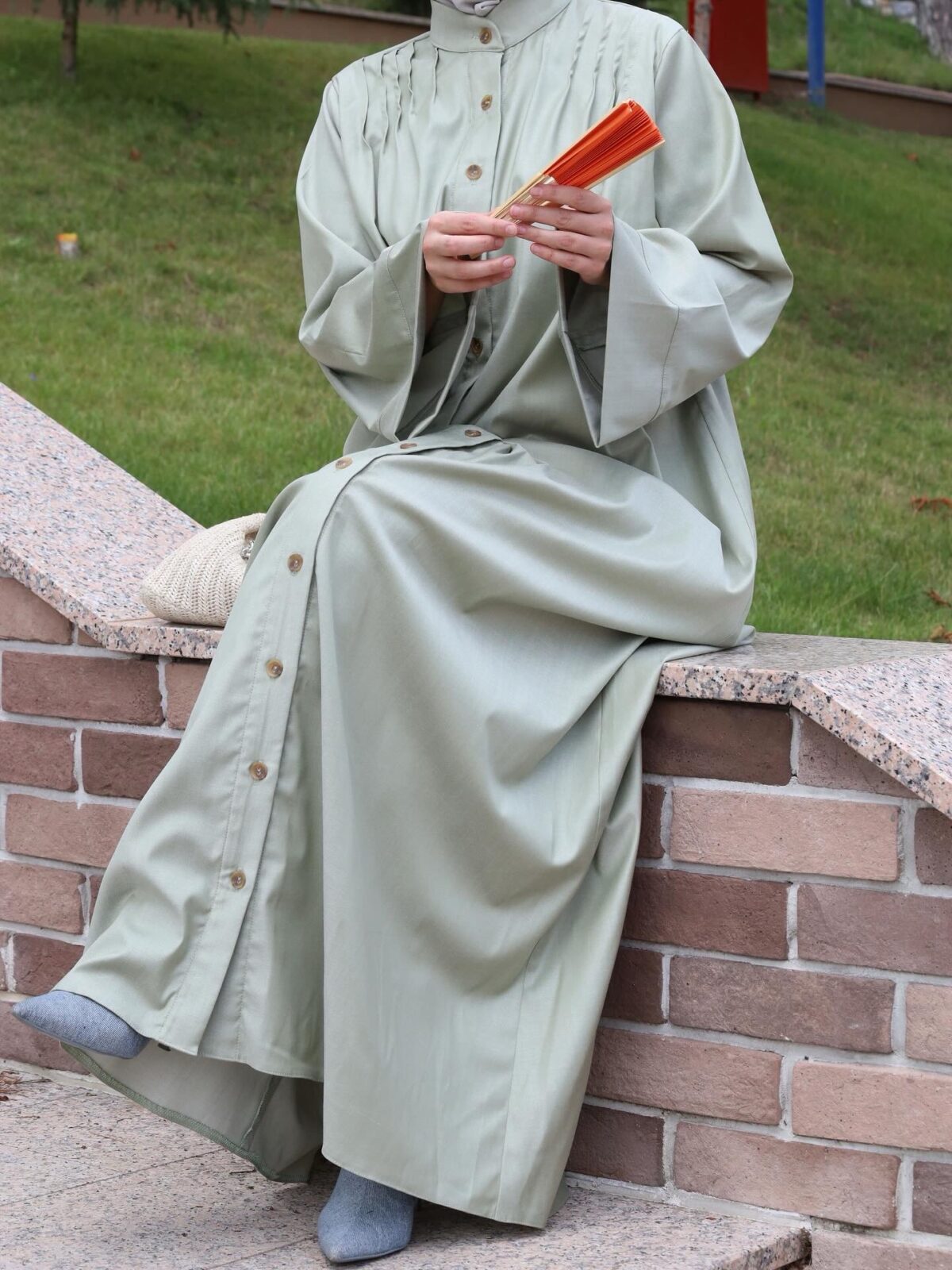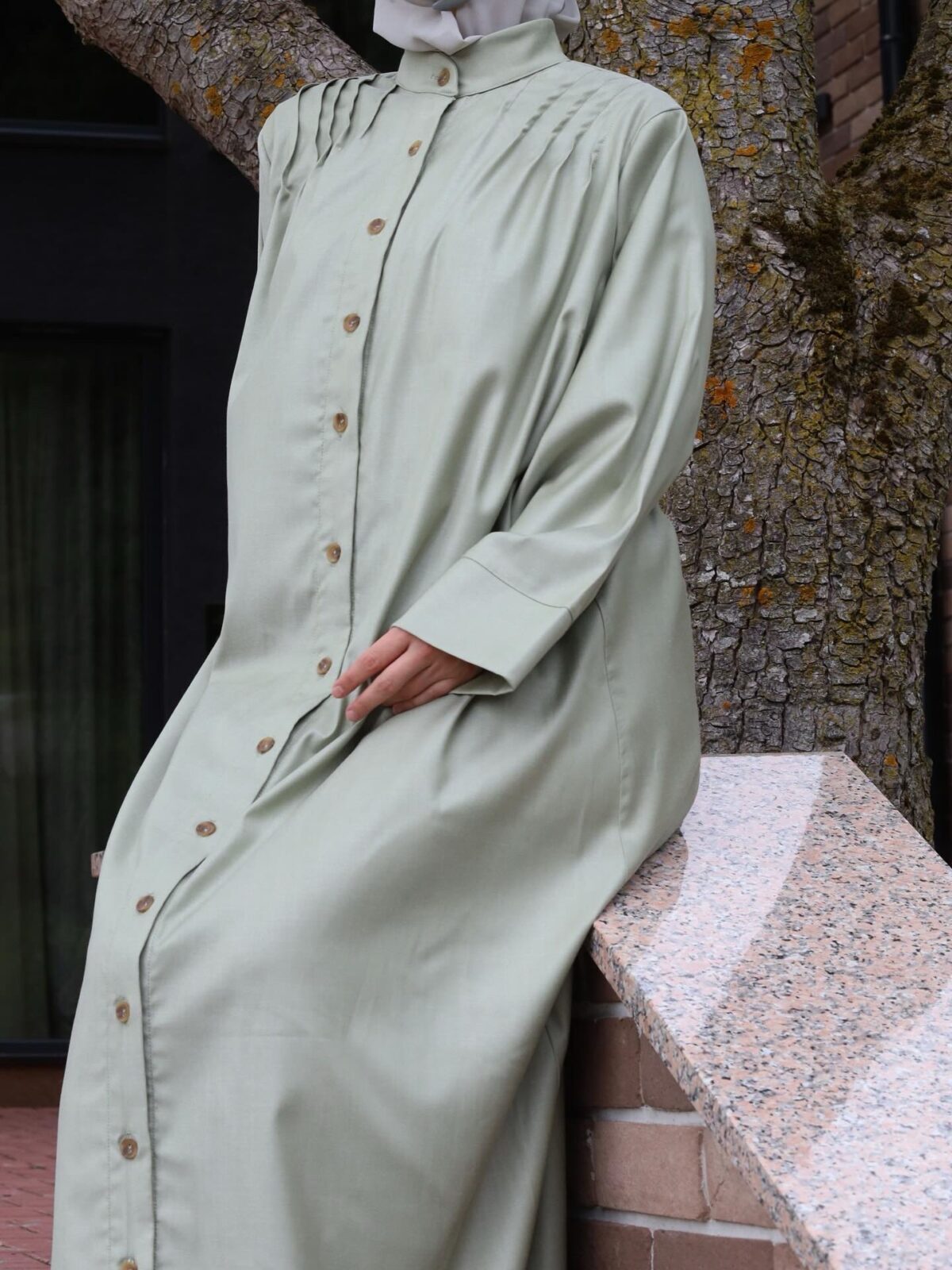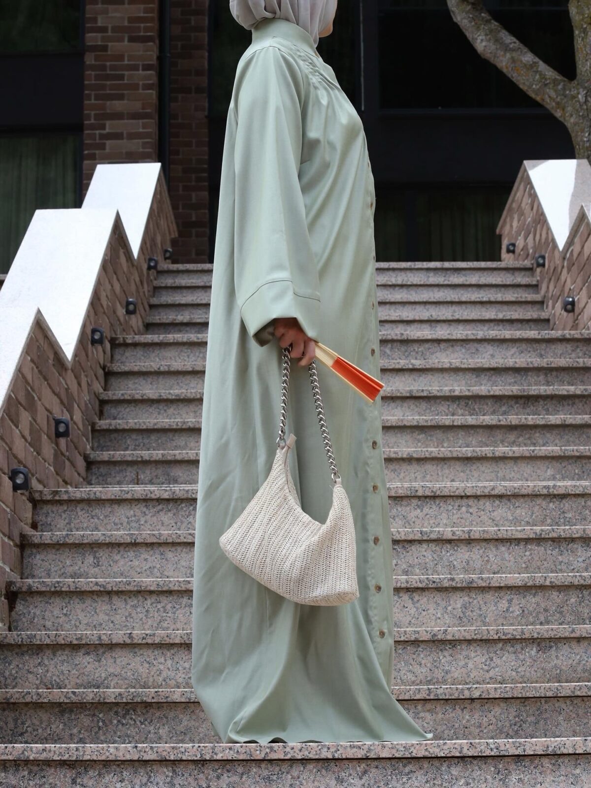 Duga haljina u mint zelenoj boji sa dugmadima niz prednji deo. Lagani materijal koji diše i opušten kroj pružaju udobnost tokom celog dana, dok klasičan dizajn omogućava lako kombinovanje za različite prilike.