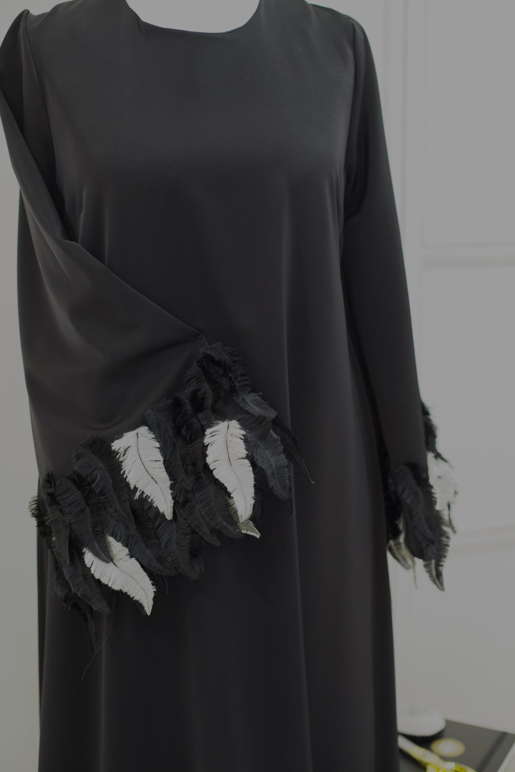 Elegantna crna haljina ravne siluete sa prepoznatljivim detaljima na rukavima.