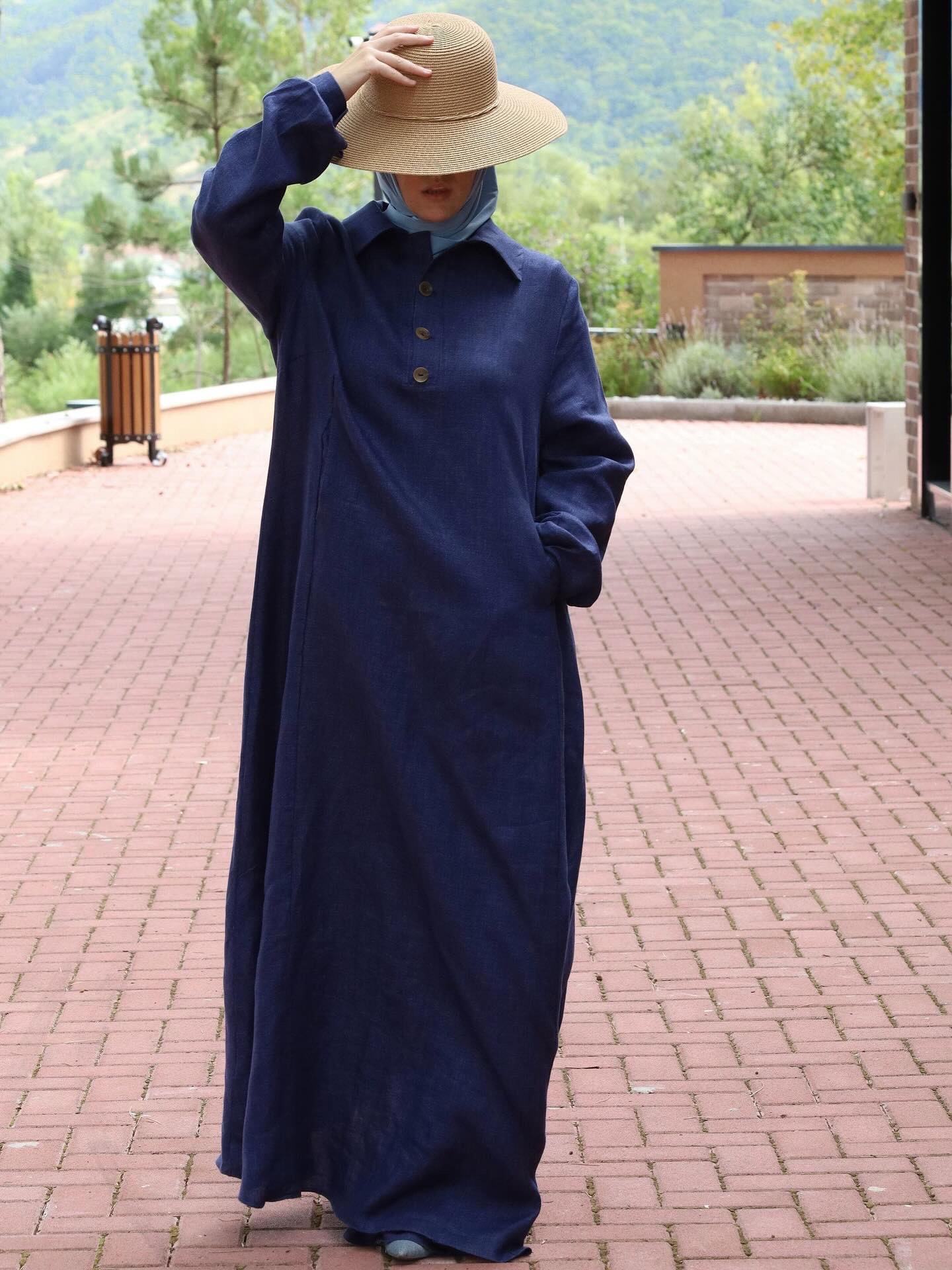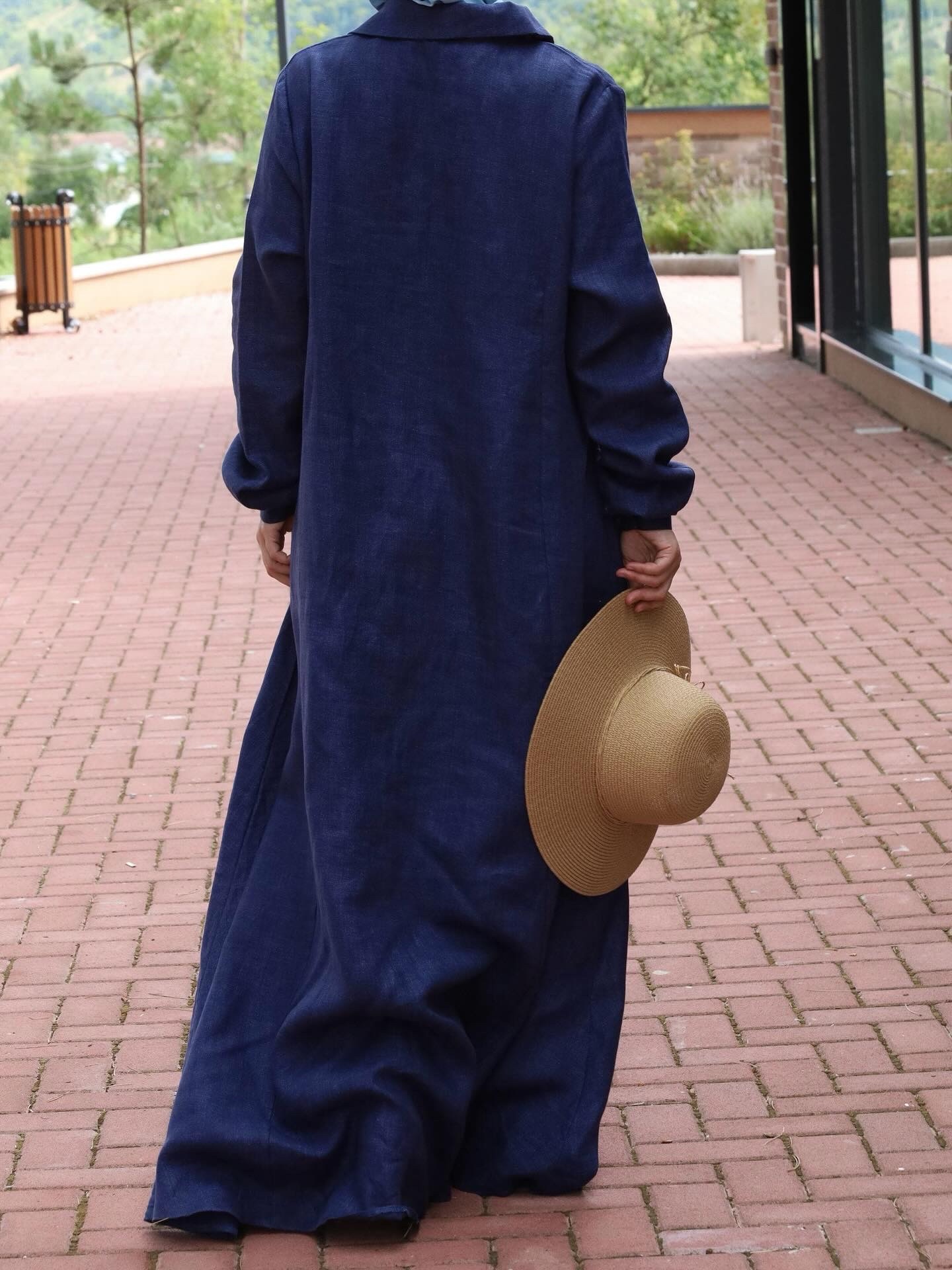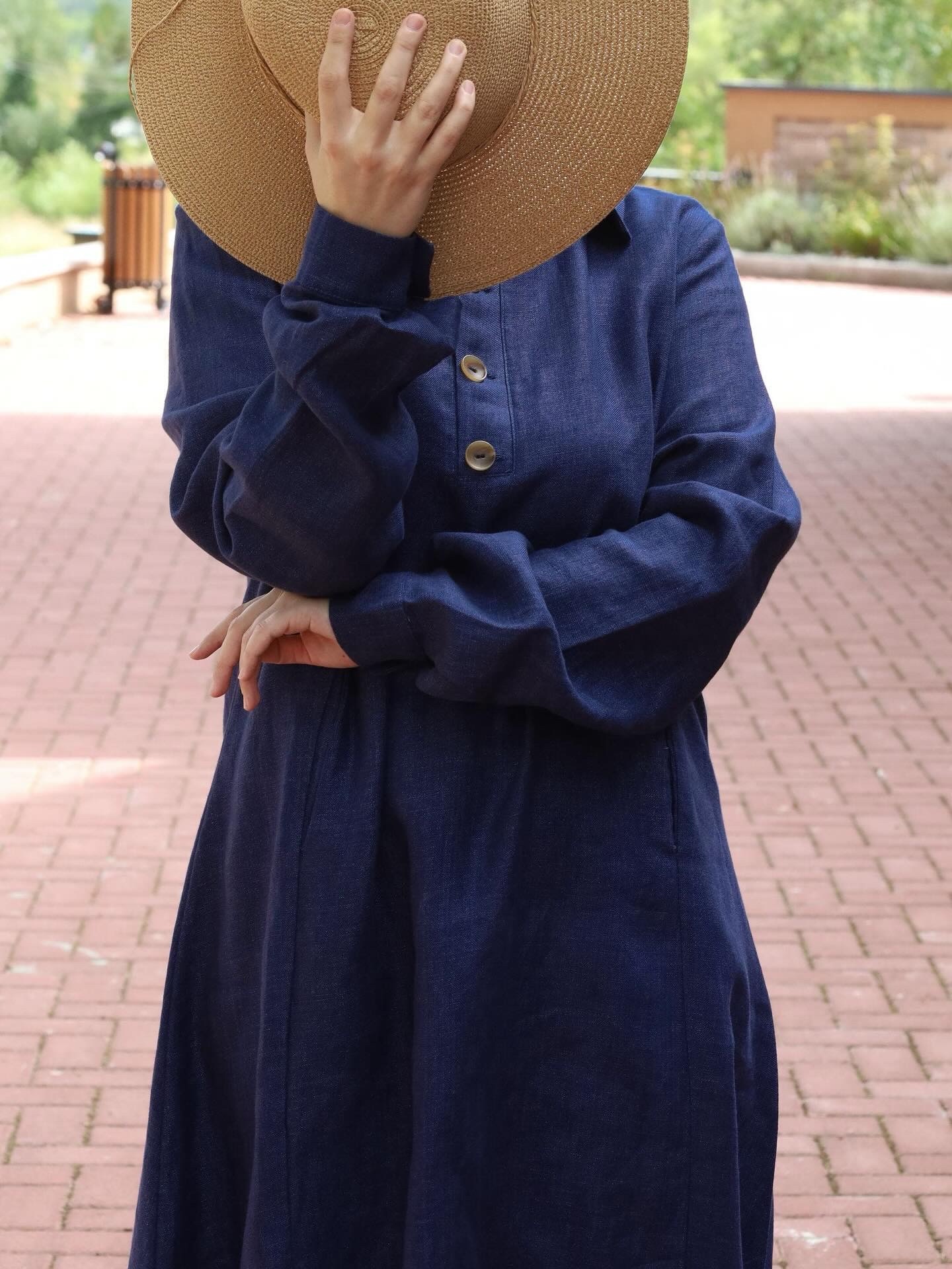 Lanena haljina u A kroju, dugih rukava, sa bočnim džepovima, kragnom i dugmicima.Prostrana i udobna, izrađena od prirodnog lana
