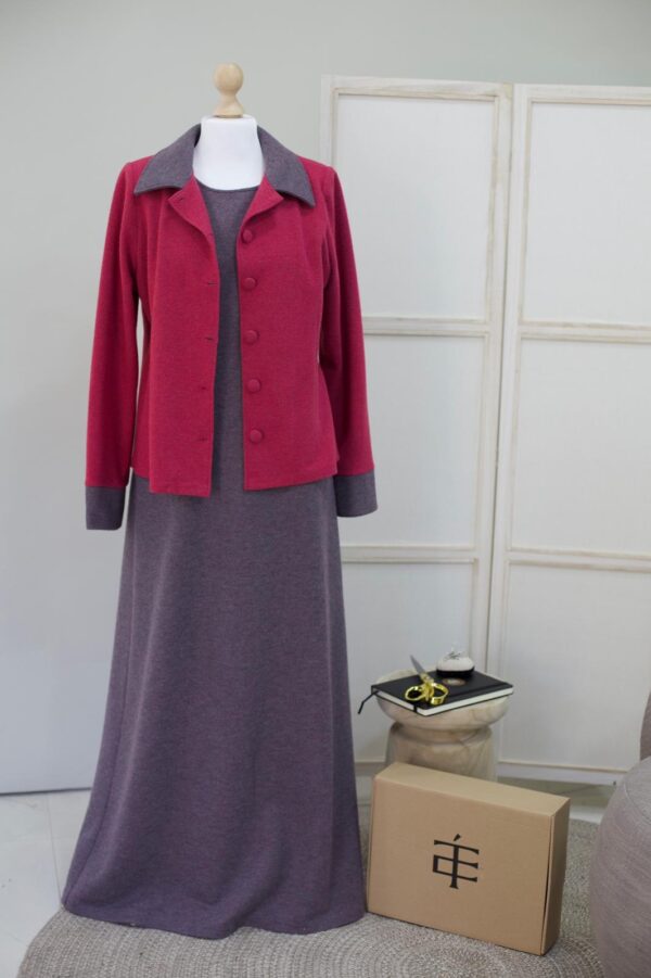 Crvena haljina.Ravan kroj, visoki okovratnik i fini biserni završetak — detalji koji čine razliku.